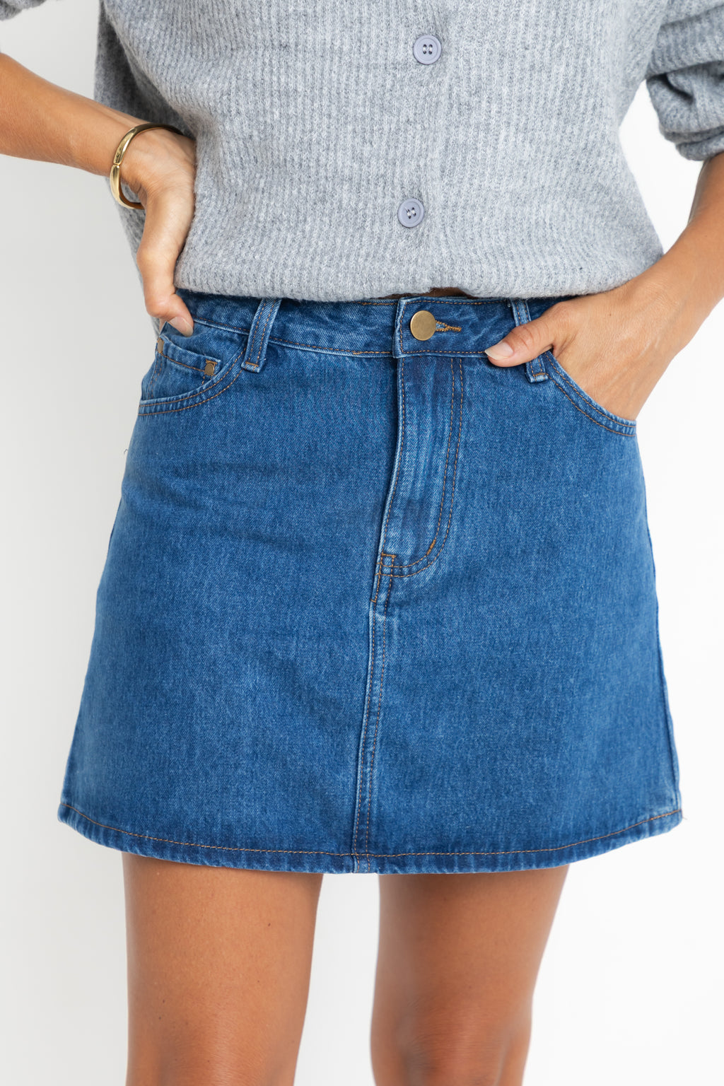 Dylan Denim Mini Skirt - Mid Blue Wash - The Self Styler Exclusive
